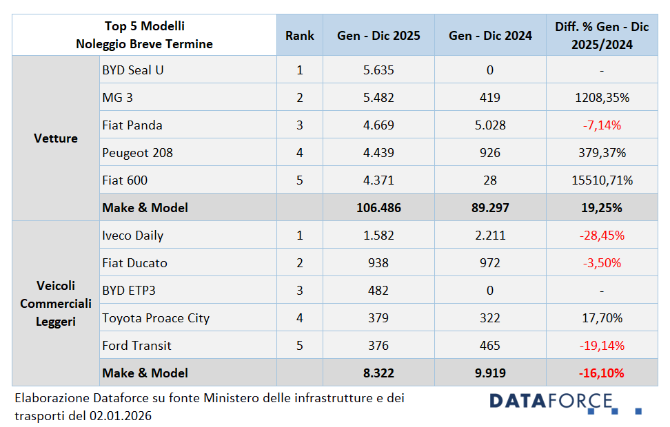 Nel noleggio a breve termine (NBT) la Top 5 delle vetture alla fine del 2025 vede salire al primo posto la BYS Seal U, un modello che nel 2024 non era nemmeno in classifica perché in fase di lancio in Italia. Al secondo posto la MG 3 (+1.208,6%), seguita da Fiat Panda (-7,1%) che è terza anche sul quarto trimestre, Peugeot 208 (+379,4%) e Fiat 600 (che nel 2024 era praticamente assente in questo comparto). In ambito LCVIveco Daily (-28,5%) mantiene il primato, a seguire Fiat Ducato, BYD ETP3, Toyota Proace City e Ford Transit.