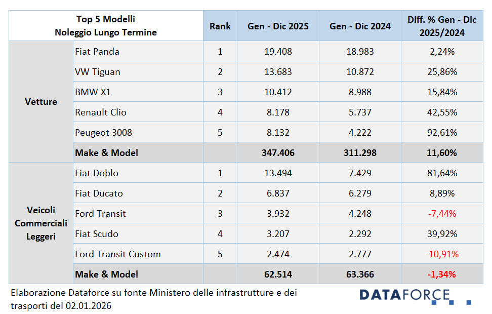 Nella classifica finale del 2025 la Fiat Panda rimane il modello più noleggiato nel lungo termine, con un totale di circa 19.400 unità da gennaio a dicembre (+2,2%), con ampio distacco sugli altri modelli della Top 5 del noleggio a lungo termine. Però, se si guarda al solo quarto trimestre, la prima posizione è stata conquistata dalla Volkswagen Tiguan, che risulta seconda al termine dell’anno, in crescita nelle immatricolazioni di noleggio a lungo termine del 25,9%. Le posizioni seguenti della Top 5 NLT autovetture dell’intero anno sono: terza BMW X1 (+15,8%), quarta Renault Clio (+42,6%) e quinta Peugeot 3008 (+92,6%). Tra i veicoli commerciali leggeri, il modello più noleggiato è una conferma: il Fiat Doblò, con immatricolazioni quasi raddoppiate (+81,6%). Nelle posizioni successive Fiat Ducato (+8,9%), Ford Transit (-7,4%), Fiat Scudo (+39,9%) e Ford Transit Custom (-10,9%).